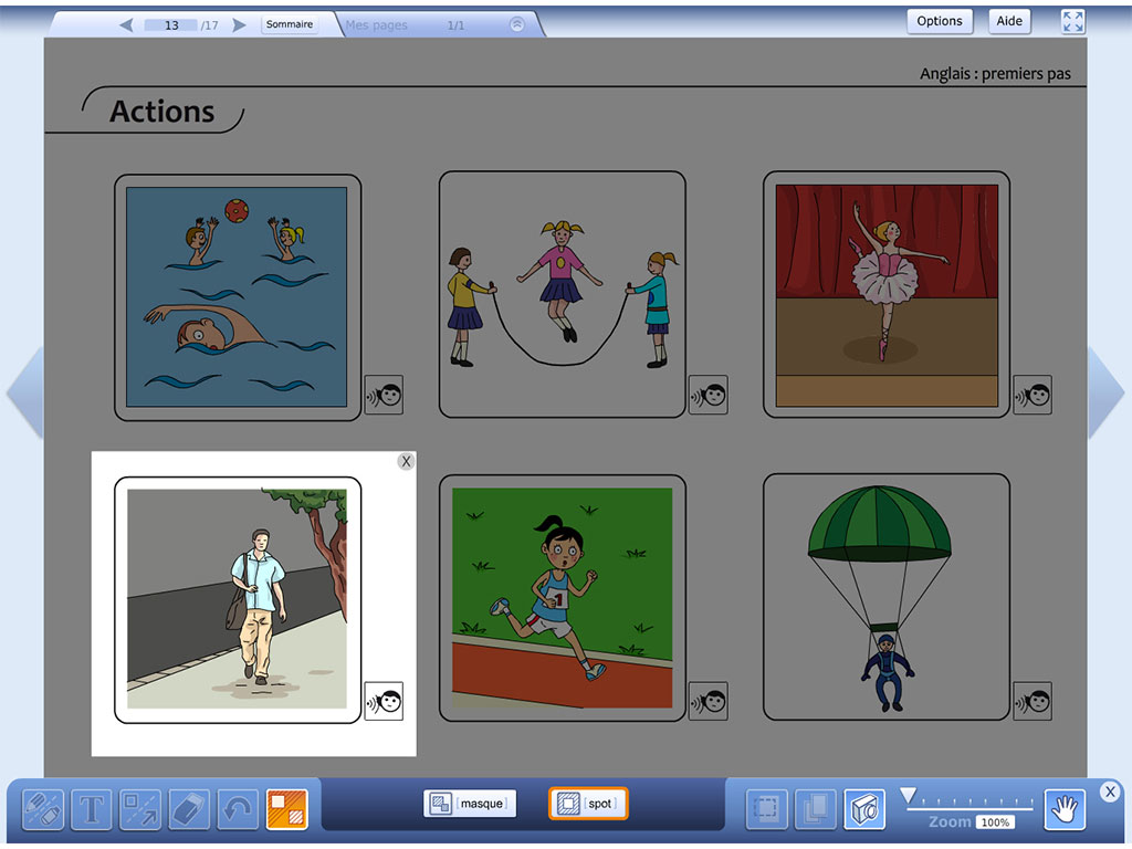 Il propose 17 activités interactives et ludiques basées sur des thématiques proches de l'environnement des élèves. Ces activités favorisent ainsi l'expression orale avec la classe entière ou en petit groupe.