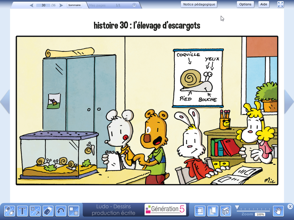 Les posters, illustrations, textes du manuel et des cahiers d'exercices sont présentés sur grand écran. L'enseignant peut alors faire travailler les élèves sur la langue orale et la langue écrite en français.