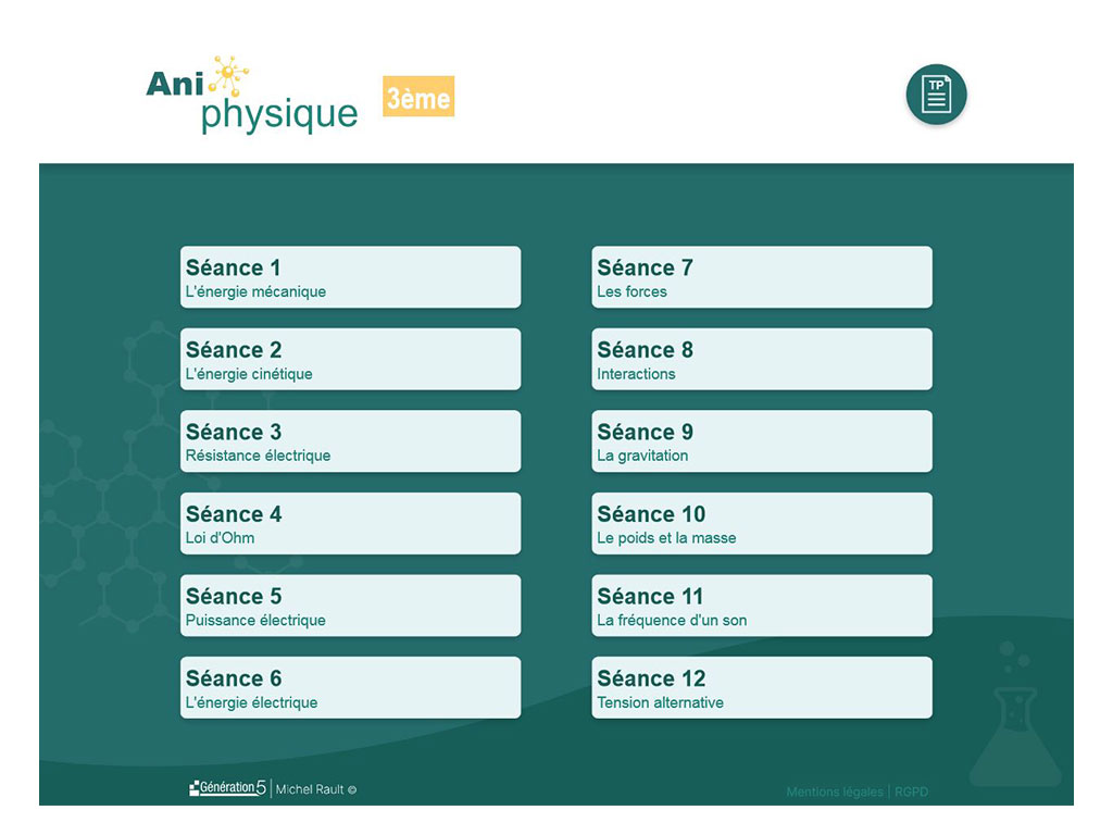 Ces séances permettent de mettre en œuvre le cours avec 89 activités numériques ludiques au travers d'outils de simulation d'expériences.