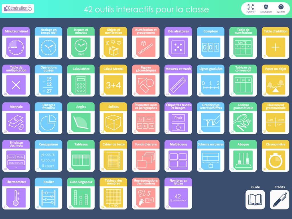 Le logiciel 42 outils interactifs pour l'école propose un panel complet d'outils numériques utilisables dans toutes les disciplines en élémentaire, avec un TBI ou vidéoprojecteur : abaque, boulier, cubes encastrables (méthode de Singapour), instruments de mesure, etc.