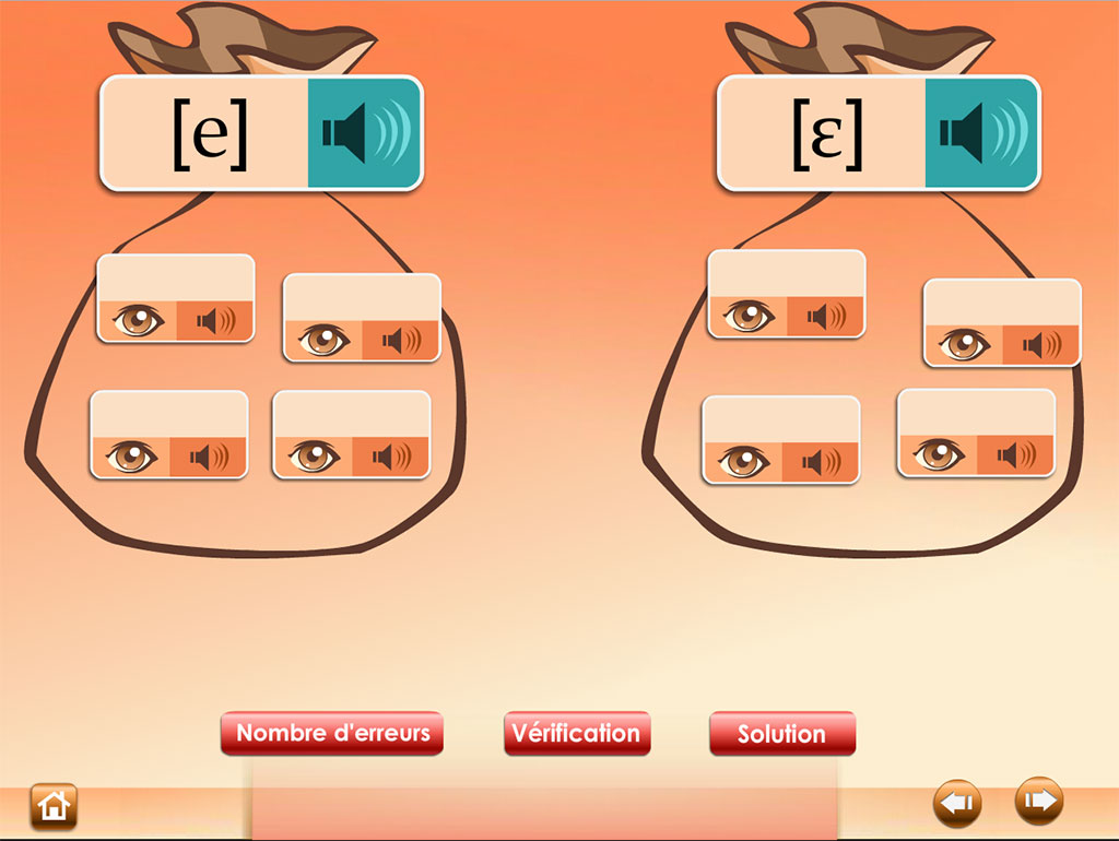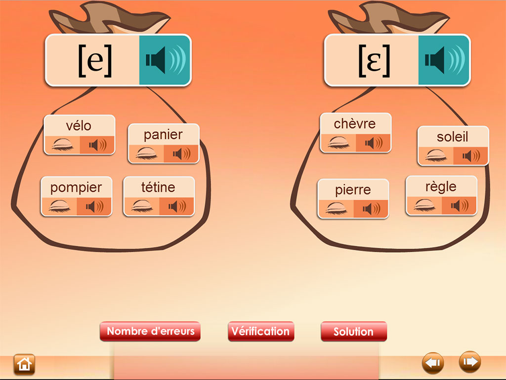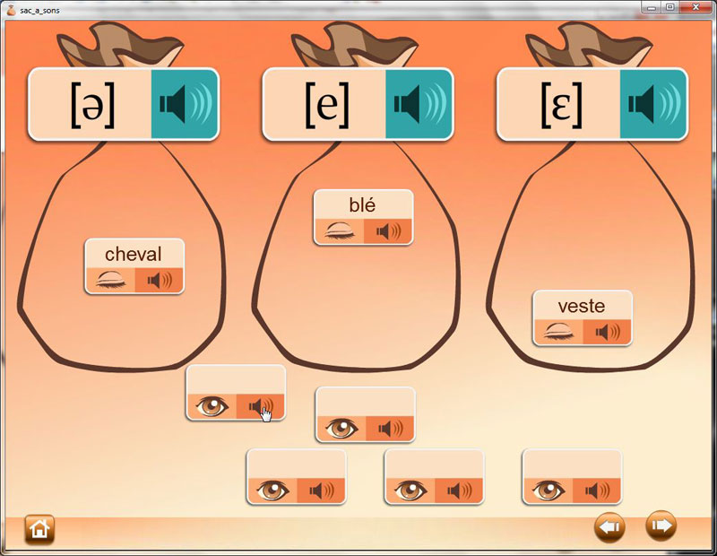 L'élève écoute et déplace les étiquettes-mots dans les "sacs à sons" correspondants. La reconnaissance s'effectue en affichant ou non l'écriture des mots selon qu'on privilégie l'écoute ou la lecture.
