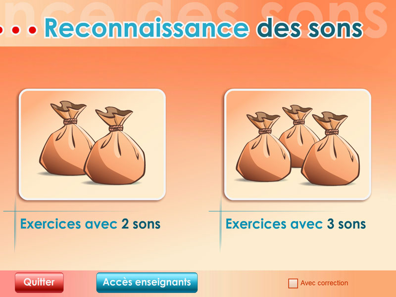 Ce programme permet de travailler la reconnaissance des sons en Maternelle (Grande section), CP et CE1 : l'enseignant peut mettre l'accent sur la discrimination auditive, sur la discrimination visuelle ou sur la combinaison des deux.