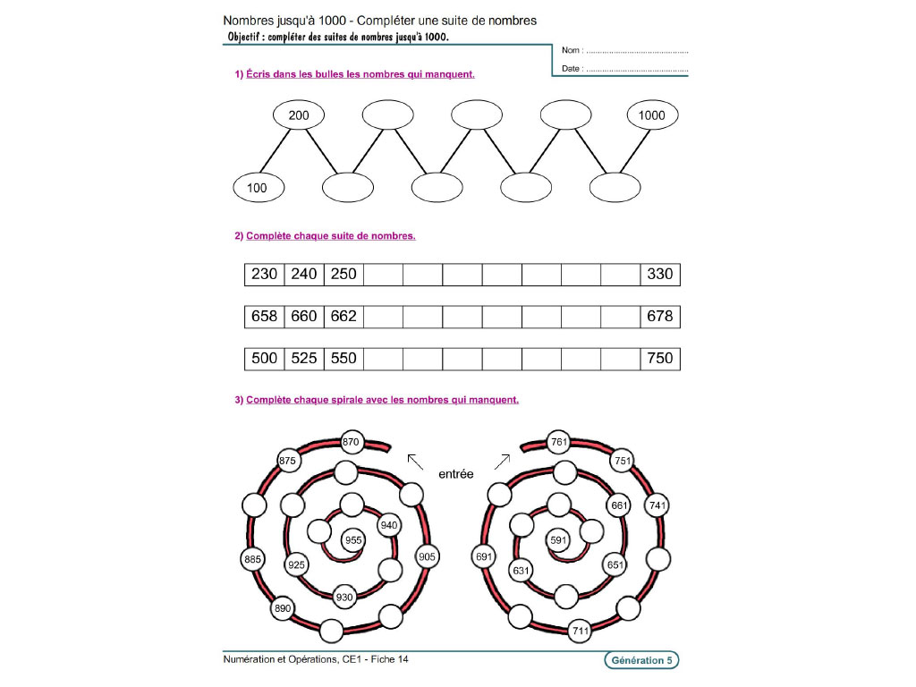 - Nombres jusqu'à 1000 : écrire les nombres en lettres et chiffres / décomposer les nombres / écrire sous forme de code / compléter des suites / comparer et ranger les nombres / retrouver les différentes écritures d’un nombre...