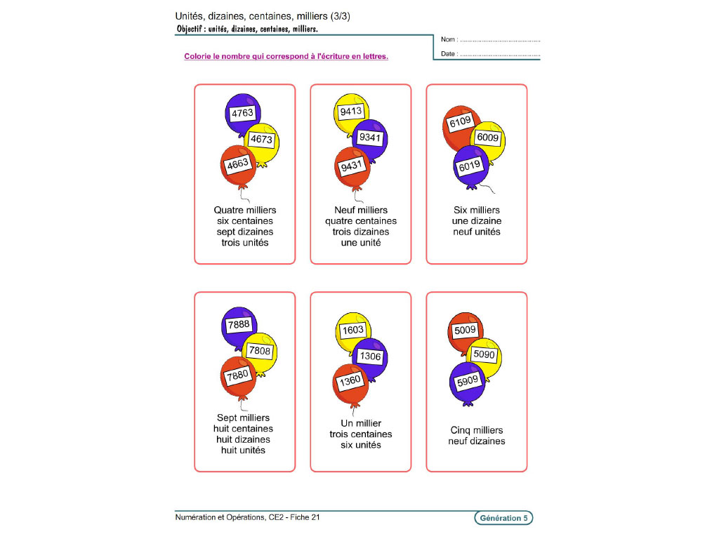 - Nombres jusqu'à 10 000 : Écrire en lettres et chiffres / Compter de 5 en 5, de 50 en 50, de 100 en 100 / Écrire les nombres de 3 en 3, de 20 en 20, de 100 en 100… / Compléter les suites de nombres / Écrire sous forme de code / Unités, dizaines, centaines, milliers… / Décomposer et recomposer les nombres / Placer les signes < , = et > / Ranger les nombres par ordre croissant / Écrire en chiffres arabes et romains...
