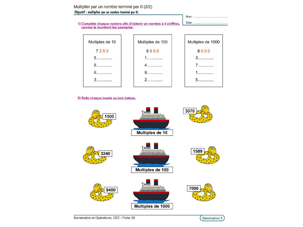 - Tables de multiplication de 0 à 9 / Multiplier par 10, 100 ou 1000 / Compléter des égalités / Multiplier par un nombre terminé par 0 / Compléter pour obtenir un nombre à 4 chiffres / Multiples de 10, 100, 1000 / Multiplicateur à 1 chiffre : effectuer en colonne, multiplications à trous / Effectuer une multiplication avec un multiplicateur à 2 chiffres...