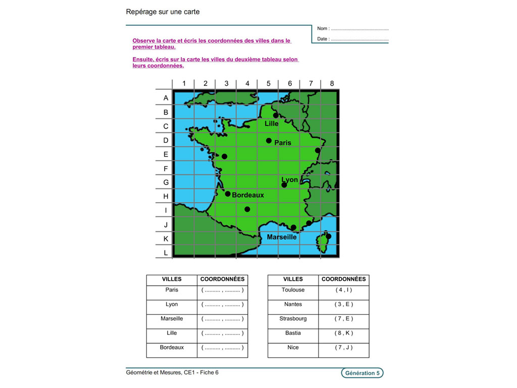 - Repérage et orientation / Repérage de cases et de nœuds / Repérage sur un dessin, sur un plan, sur une carte / Déplacement sur un quadrillage / Compléter une figure / Compléter une figure dans un quadrillage différent.