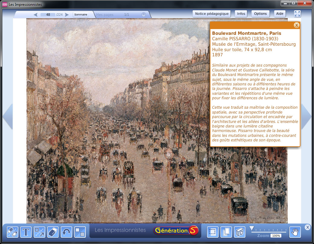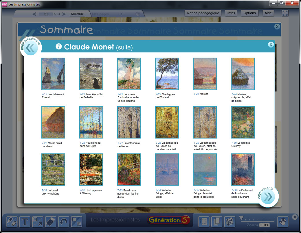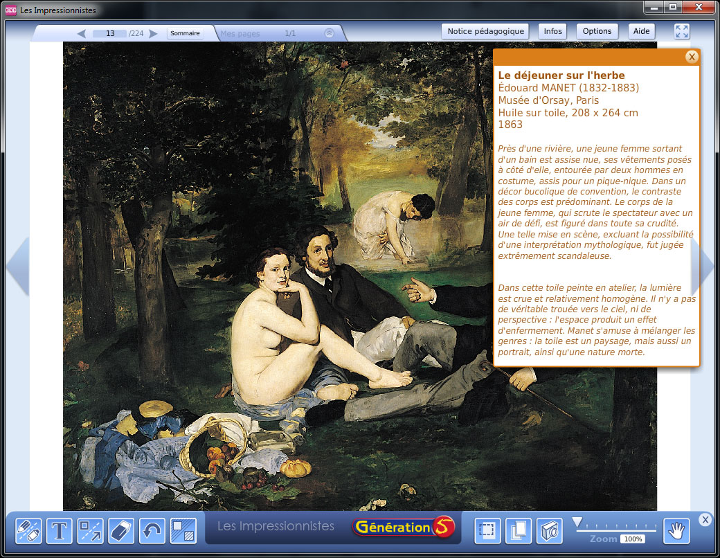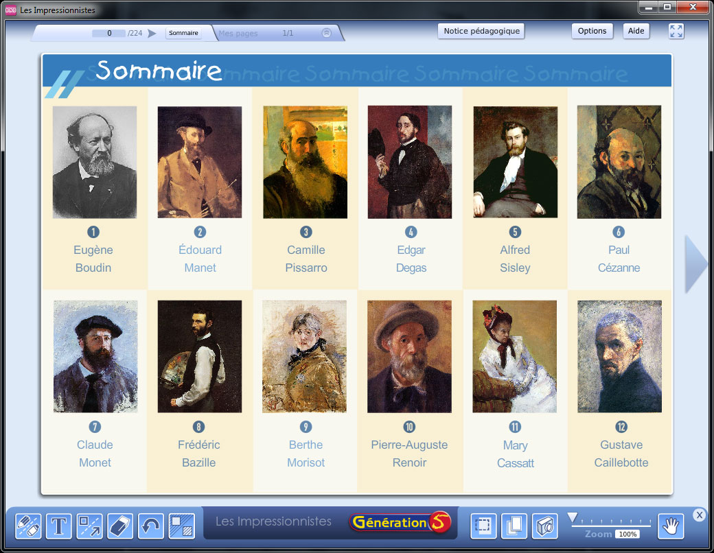 Les Impressionnistes ont fait profondément évoluer le mode de représentation picturale. Ce logiciel présente et analyse les œuvres des peintres de ce courant artistique.