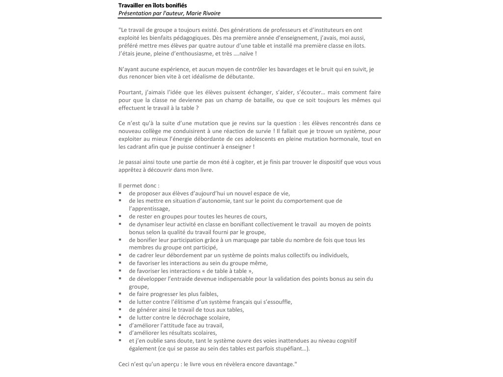 "Le travail de groupe a toujours existé. Des générations de professeurs et d’instituteurs en ont exploité les bienfaits pédagogiques. Dès ma première année d'enseignement, j’avais, moi aussi, préféré mettre mes élèves par quatre autour d’une table et installé ma première classe en ilots. J’étais jeune, pleine d’enthousiasme, et très ….naïve !
