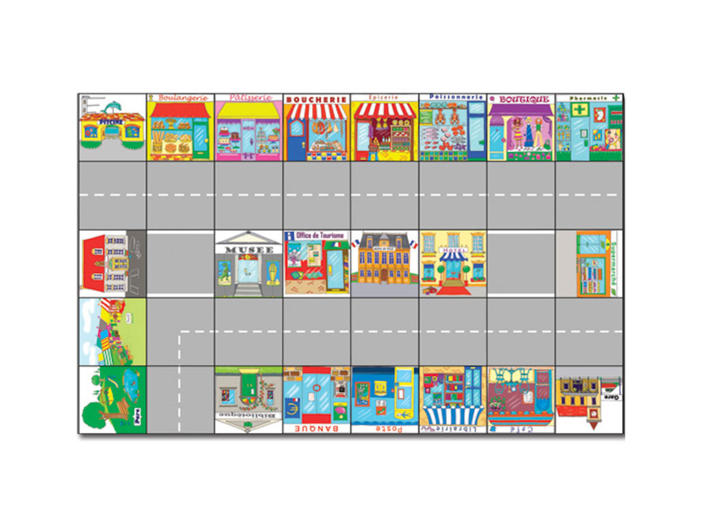 - La ville (120 x 75 cm) : propose une promenade dans l'environnement urbain, avec les noms des magasins.
