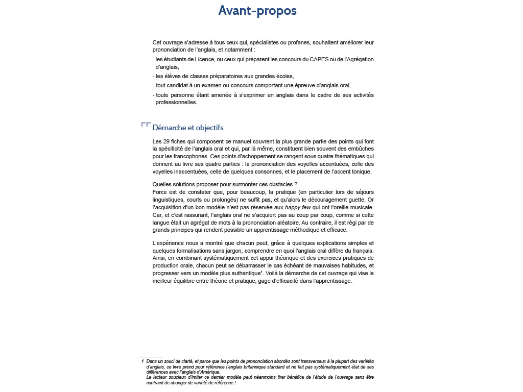 Bien prononcer l'anglais pour les francophones s’adresse à tous ceux qui visent à améliorer leur prononciation de l'anglais. Il s'attache particulièrement aux spécificités de l’anglais oral qui sont souvent des embûches pour les francophones.