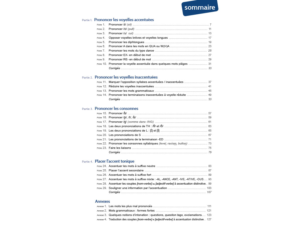 • 4 annexes abordant des thématiques ciblées : les mots les plus mal prononcés, les formes fortes des mots grammaticaux, l'intonation des questions et exclamations, l'accentuation des homographes (nom-verbe ou adjectif-verbe).