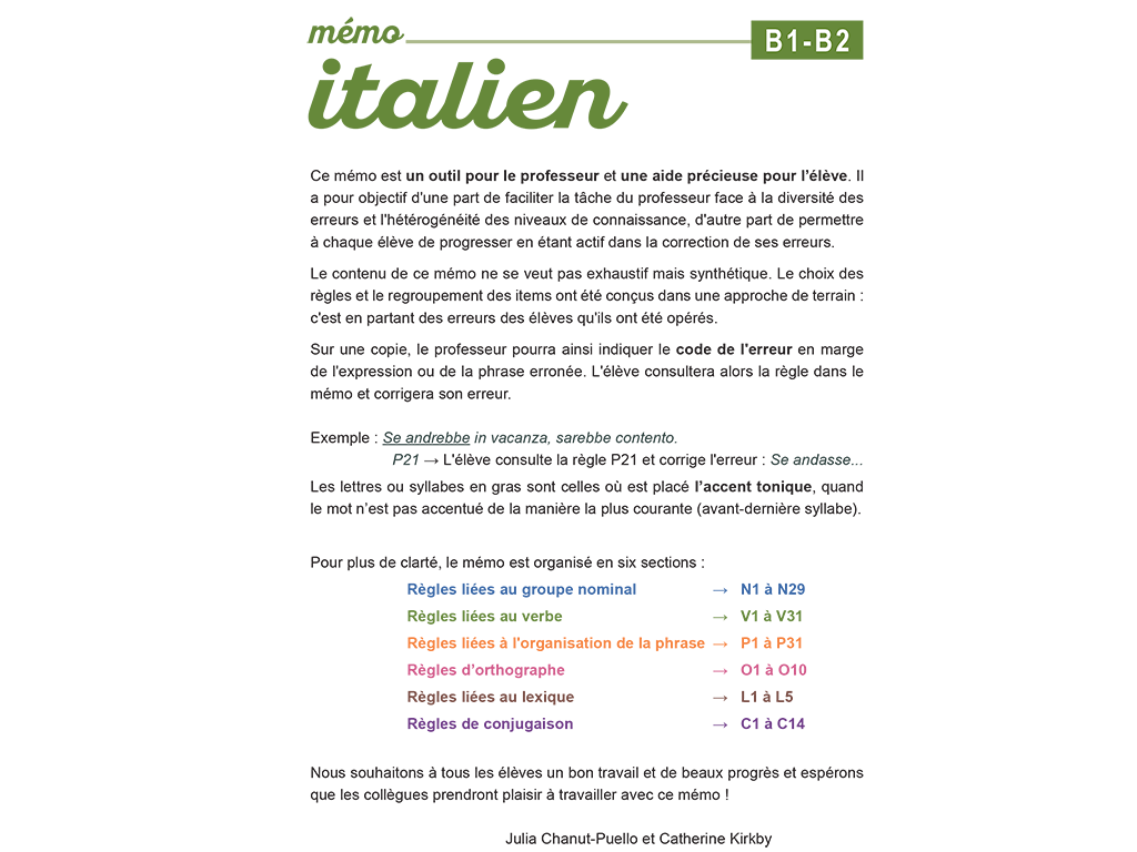 Ce Mémo Italien B1-B2 de 60 pages présente 118 règles et notions essentielles pour maitriser l'italien au lycée. Il permet à l'élève de s'auto-corriger et simplifie la tâche de correction du professeur.