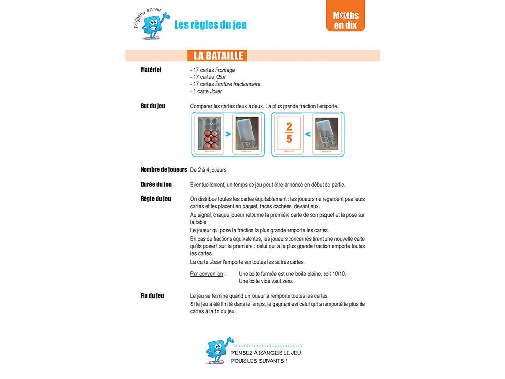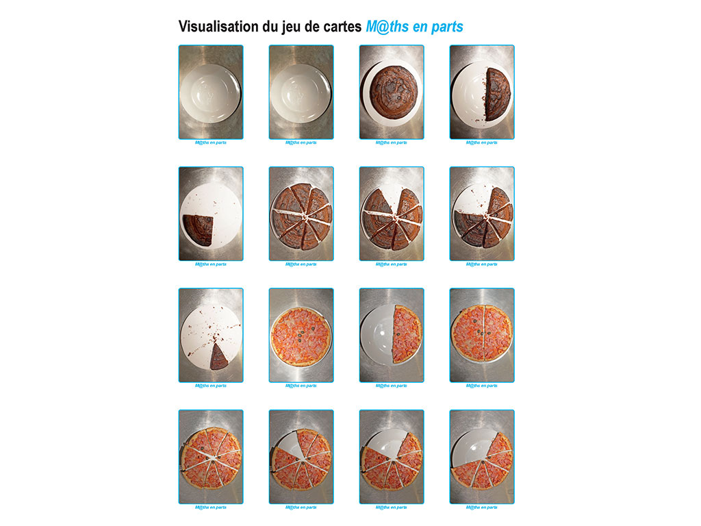 - Jeu de 54 cartes : le but est de comparer des fractions représentées sous différentes formes (photos ou écriture fractionnaire).