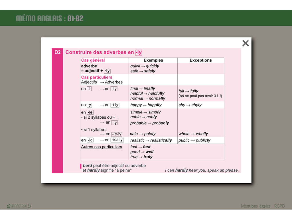 Conçue pour une utilisation 100% numérique, elle permet aux élèves de réviser les règles et notions essentielles de la langue anglaise puis de s’entrainer instantanément avec les exercices interactifs.