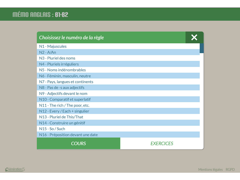 - Plus de 100 séries d’exercices interactifs variées et aléatoires (texte à trous, mot à déplacer ou à rajouter, choix multiples, etc.)